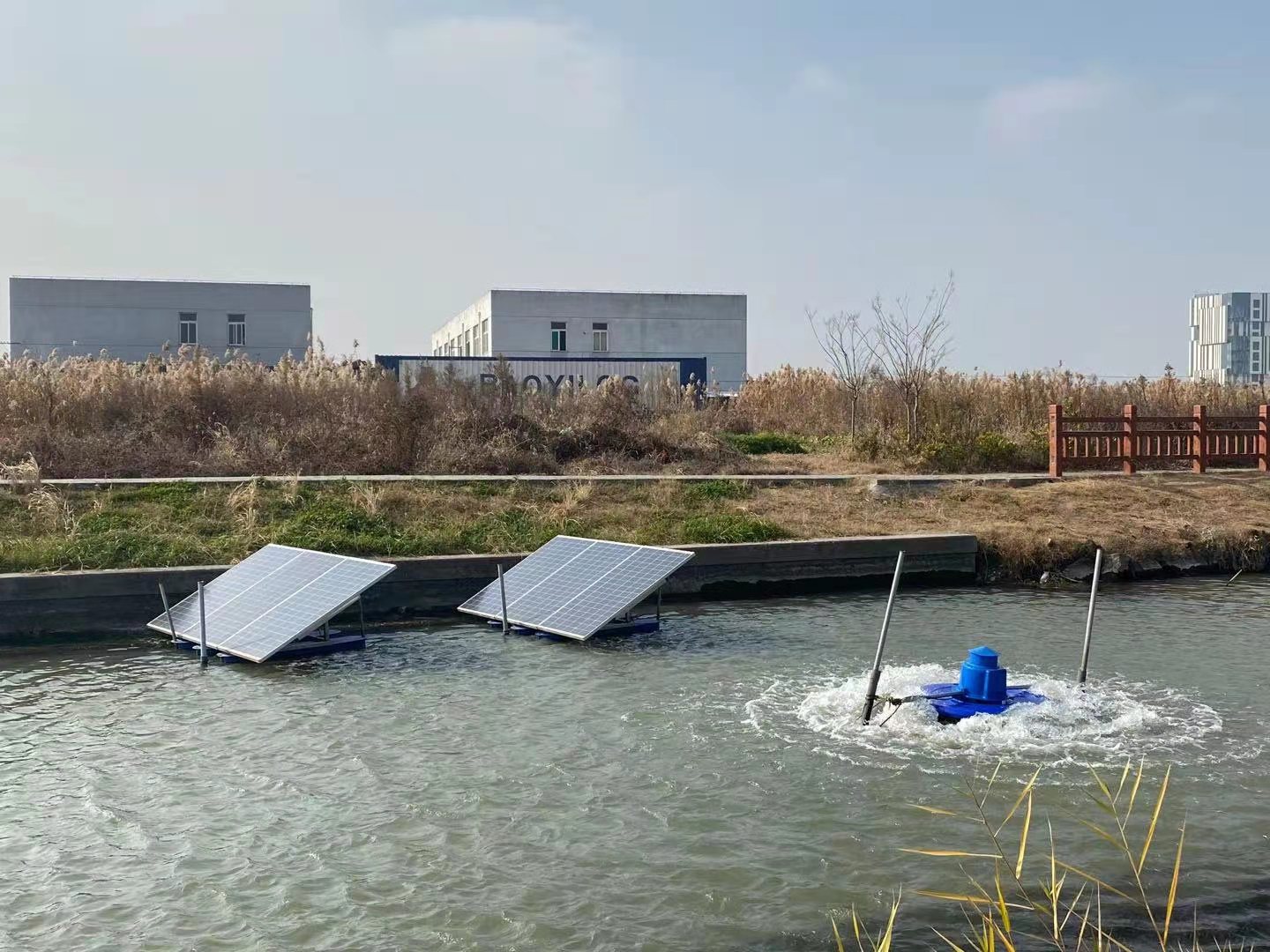 上海嘉定區5臺太陽能涌浪安裝現場--綠博斯增氧機